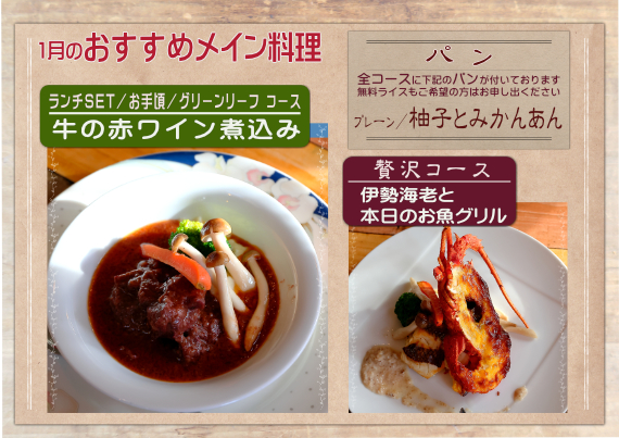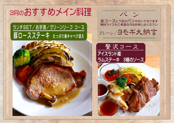 【グリーンリーフコース ¥2,500】 本日の前菜(スープ付き)/パン/メイン料理/選べるデザート+選べるドリンク