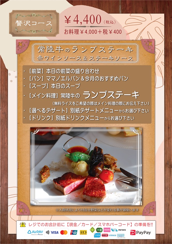 ホーム > 今月の月替わりおススメ!! > 2月の【贅沢コース ¥4,400】  ※コース詳細は写真をクリックしてください ❖ 常陸牛のランプステーキ 赤ワインソース&ステーキソース ❖